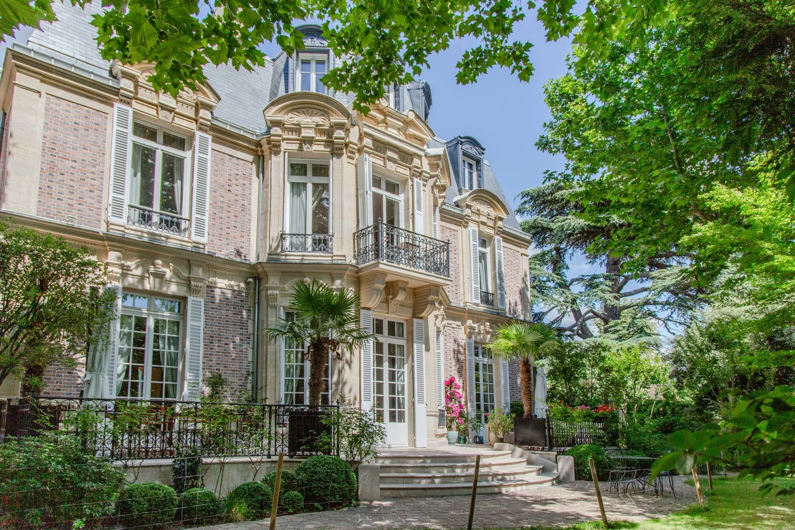 The villa is laid out over three floors and features a partial basement with a three-car garage, wine cellar, and spacious pantry. From the entrance hall, the marble floor leads to older salons and the new addition, featuring very high ceilings. The original restored salons, featuring stucco frieze ornamentation, opened onto the winter garden, offering a view of the secluded garden. Between the kitchen, which features very high-end appliances, and the winter garden, a large dining area opens onto a spacious summer garden terrace. Passing through the glass winter garden, a library leads to a cozy, wood-paneled salon with a large, authentic wood-burning fireplace. A majestic oak-wood stairway leads to the two upper floors. The second floor features three master bedrooms, each with a private terrace, and two master bathrooms. The third floor is situated above the attic, featuring exposed original wood beams, three bedrooms, and a spacious bathroom.